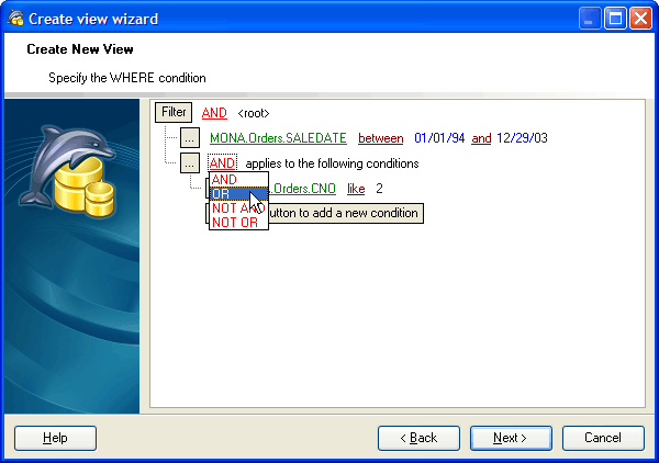 Our new complex criteria must combine conditions using the OR operator. This can be done with the help of the operator box (by default, it specifies the AND operator) and select the OR item from the drop-down menu.
