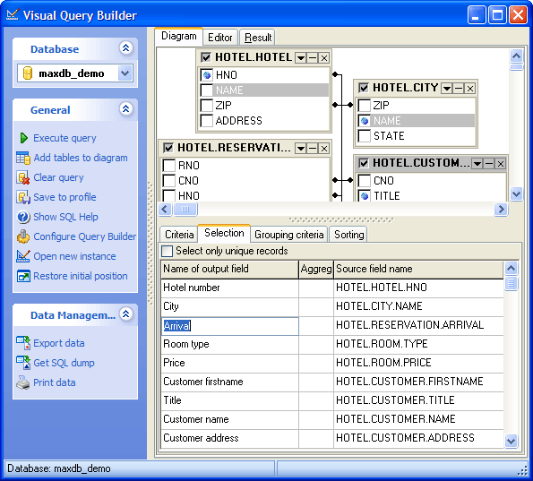 The Selection tab displays the output fields of the query. It allows you to edit the names of the query output fields, set their displaying order and set the aggregate functions (SUM, MIN, MAX, AVG, and COUNT) for each field. To remove the field from the list, select the Delete current row item from the popup menu of the field row. To modify the input query field, double-click it and then type the field name or select one from the drop-down list.