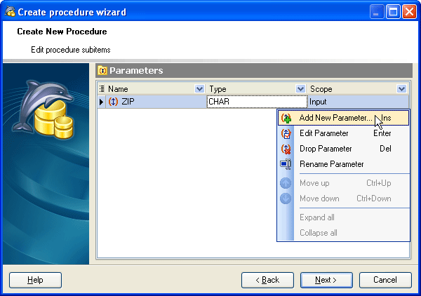 Use the pop-up menu or press Insert to add a new parameter and set its properties in Parameter Editor.