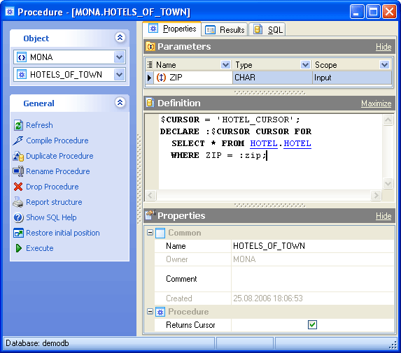 Procedure Editor allows you to execute the existing procedures or edit their definition (procedure name, parameter list, procedure body, etc.). It opens when you create a new procedure or edit the existing one (see How to edit procedure for details).