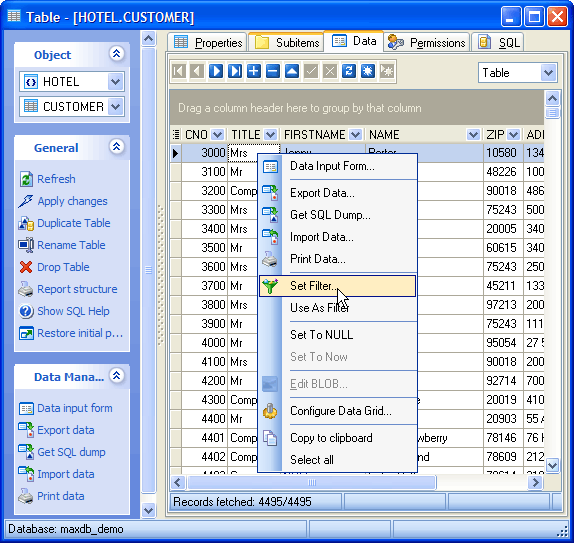 The popup menu of the grid also provides the following additional functions: use current field value as a filter, set the field value as Null, edit BLOB (for BLOB fields; see BLOB Viewer/Editor).
