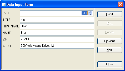To edit the grid data in the simplest way, select the Data Input Form item from the popup menu. Now you can edit data within Data Input Form. Its fields display the values of the current grid row. Use the Insert button to add the form values as a new row to the grid or use the Post button to update the current row. The Cancel button reverts all the field values within a form to their initial values (or to the last posted values). The Previous and Next buttons allow you to navigate the grid without closing the Data Input Form.
