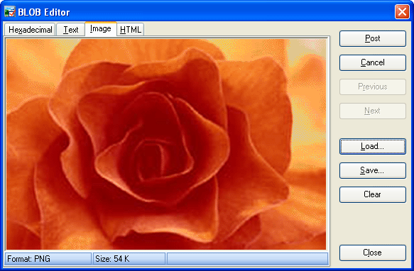 BLOB Editor provides an ability to navigate among the records using the Previous and Next buttons. Also you can load the new BLOB content and save or clear the current content by using the appropriate buttons.
