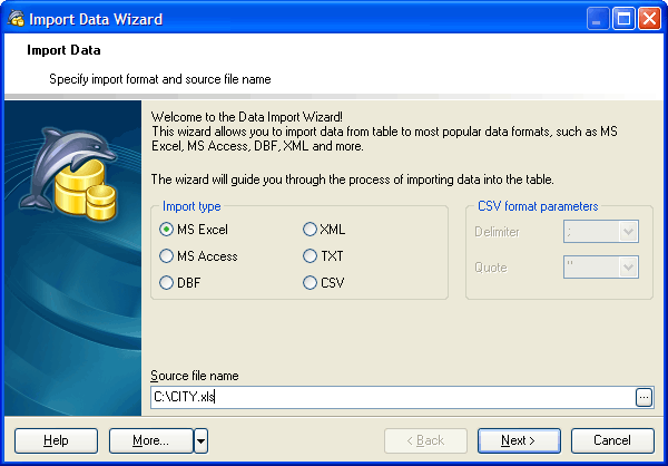 Select the type of the source file: MS Excel, MS Access, DBF, XML, TXT or CSV, and enter the source file name. The file name extension in the Source file name box varies according to the selected import type. Select the delimiter and quote characters for CSV files.