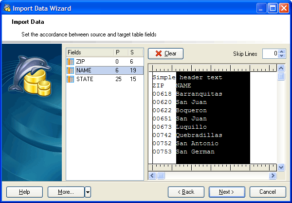 Select the target field in the Fields list, and then double-click in the text viewer area to add separators, delimiting the source column bounds. Click between the separators to assign the correspondence. Proceed to the next field when done.