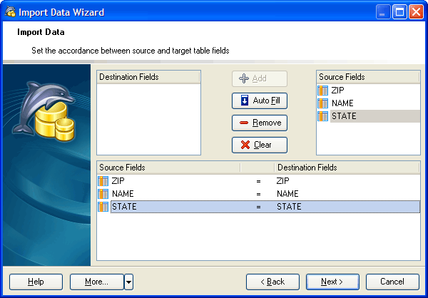 Use the Auto Fill button to set the correspondence between the source and the target fields according to the way they are ordered.