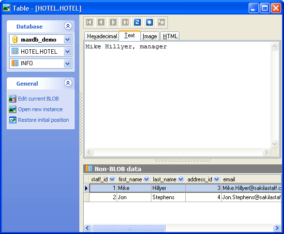 The Text panel allows you to view data as simple text. For your convenience several types of text highlighting are available (Plain text, HTML, JScript, CSS, PHP, XML, SQL, and SQLite DDL). The popup menu of the panel provides you to Find or Replace a necessary text fragment.