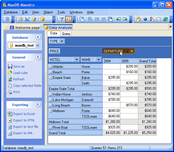 The Data tab allows to manipulate query columns according your business rules. To represent column data by rows/columns just drag the necessary column names to Column Fields / Row Fields areas respectively. The data of columns in the Data Fields area will be filtered and summarized accordingly the chosen columns and rows.