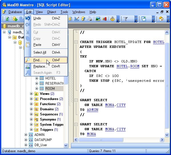 MaxDB Maestro provides two dialogs for searching and replacing text in the editor areas of the database tools. Both of them are available through the popup menu of the editor area.