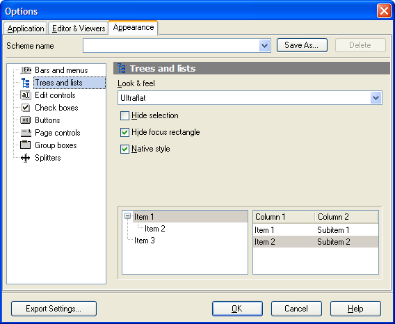 Use the Scheme name box to select the interface scheme you prefer: Office XP style, Windows XP native style, etc. You can create your own interface schemes by customizing any visual options (Bars and menus, Trees and lists, Edit controls, Check boxes, Buttons, etc.) and clicking the Save As button.