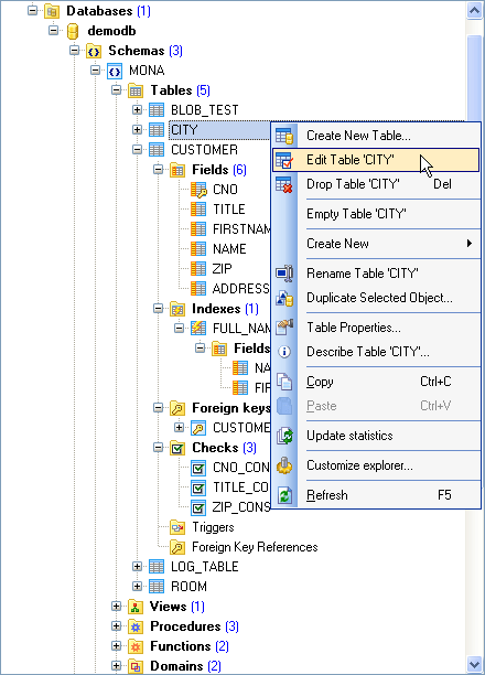 Database Explorer allows you to perform the following operations with database objects using its popup menu (note that the popup menu contains object-specific items only when some database object is currently selected in the explorer tree):
