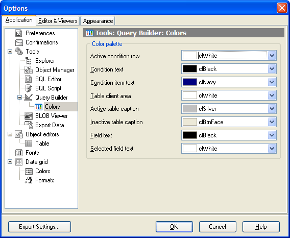 The tab is provided to editing of the Query Builder color schema. Customize colors for all editor element according to your preferences.