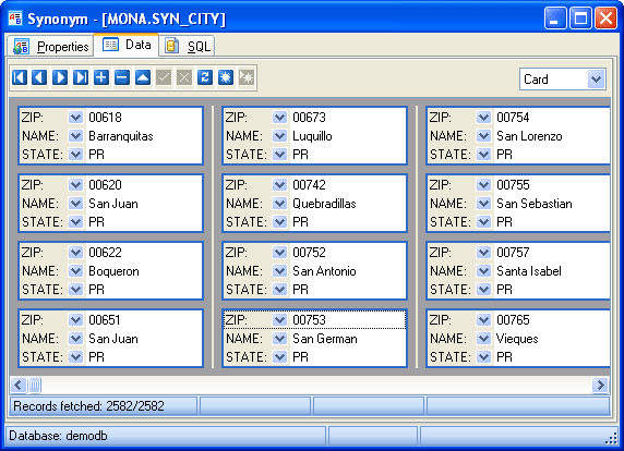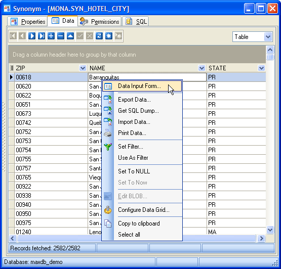The Data tab displays the synonym data as a grid (see Data View for details). Use grid’s popup menu to open Data Input Form, to invoke the Export Data, and Get SQL Dump modules, to set the value of the selected record to NULL or to Now (for Date values).
