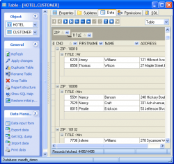 MaxDB Maestro provides you with powerful tools for viewing, editing and printing data from tables and queries. Click the column caption to sort data by the column values in the ascending or descending mode. You can also group grid data by any of the columns by dragging the column header to the destination area as well as filter records in the grid. |