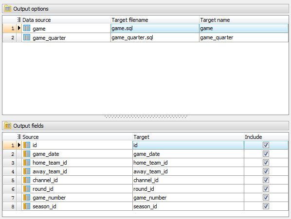 The wizard creates a separate dump file for each selected table. By default, the file names are %source_table_name%.sql, but you can modify names of files to be created as well as include dumped tables in SQL scripts with another names, and also exclude some fields or rename them.