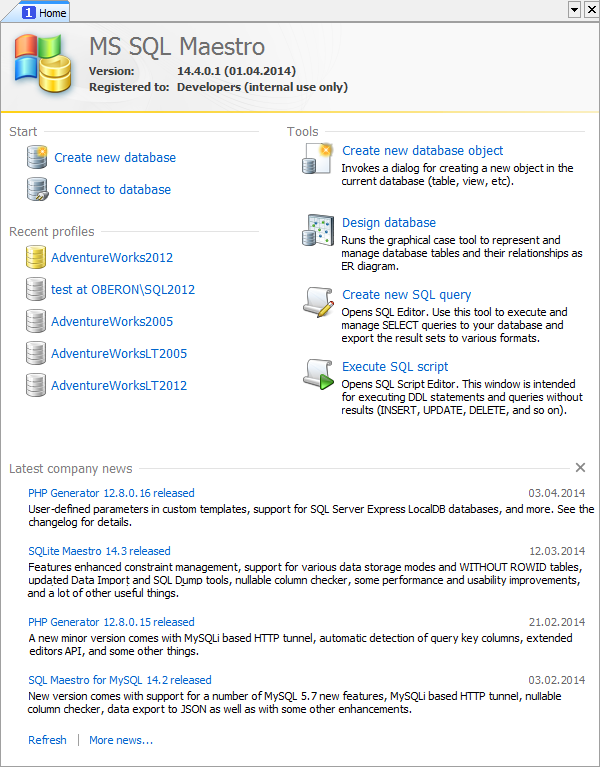 The window provides you with quick access to the Create Database Object dialog, Schema Designer, SQL Editor, and SQL Script Editor recently used database profiles. At the bottom of the page the latest company news and current discount programs are represented.