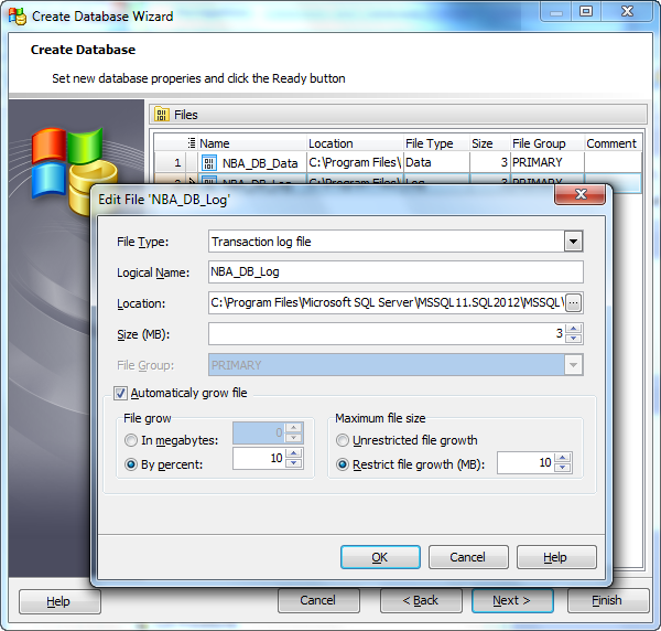 Click Next after you have added all the database files. Click Finish to create the database without setting special properties.
