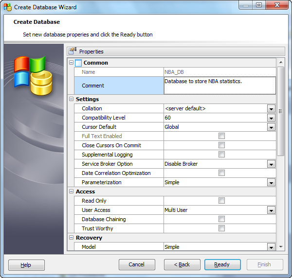 Specifying database properties