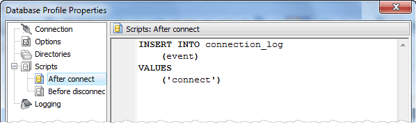 Below you can find an example of an obligatory script to execute after MS SQL Maestro will connect to the database. The script writes a connect time to the log table.