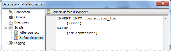 The next screen represents the example of an obligatory script to execute before MS SQL Maestro will disconnect from the database. The script writes a disconnect time to the log table.