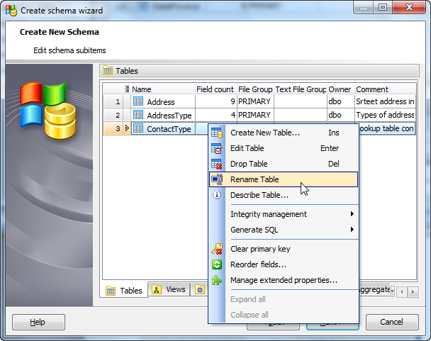 | • | Open the corresponding tab (Tables - to manage schema tables, Views - to manage schema views, and so on); |