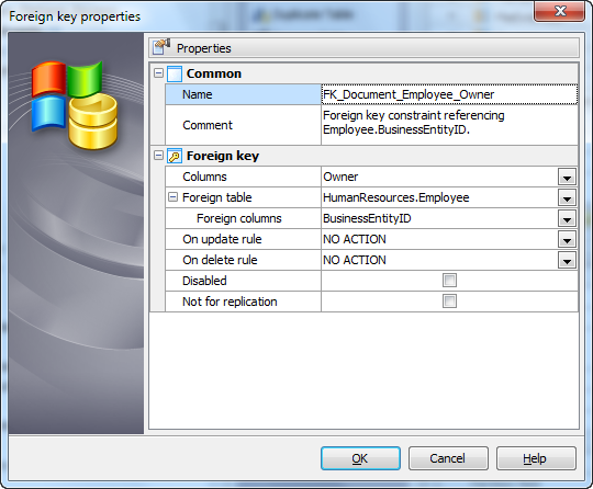 Set the Foreign Key Name, select Columns from the Available Fields list to include into the foreign key, select the Foreign Table Name from the drop-down list and its fields from the list to include, set other foreign key properties and apply the changes by clicking the OK button.
