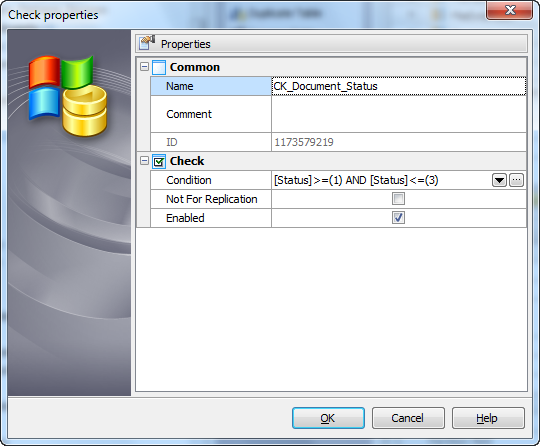 The Check Properties editor allows you to add a new check constraint or edit an existing one. This dialog can be invoked from Table Editor, or via the popup menu of the corresponding nodes of the explorer tree.