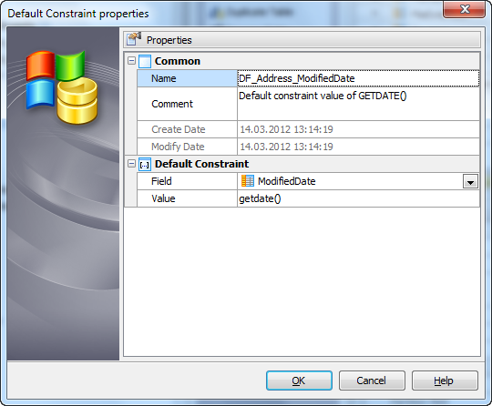 Table default constraints are created within the Default Constraint Properties dialog window. In order to open the dialog you should either