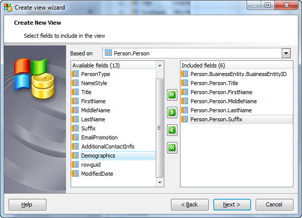 Select a table or a view from the Based on drop-down menu. Then specify which fields will be used in the new view. Use Add All or Add Selected buttons to include field(s) into view definition. Use the Remove Selected or Remove All items to exclude field(s) from the view's field list. Click the Next button to proceed.