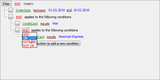Suppose we need to select orders made between 01.02.2010 and 10.02.2010 and payed via 'Visa' or 'American Express'. This is a complex filter condition combining two simple conditions with the OR operator. Conditions from the same root level are combined by the AND operator. To add a condition combined with the previous one with the OR (NOT AND, NOT OR) operator, use a new group of conditions.
