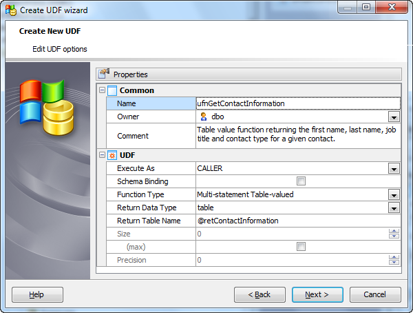 Specify the properties for the new UDF according to your needs. The detailed description is given below.