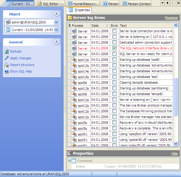 MS SQL Maestro allows you to view and analyze SQL server logs. All logs are automatically separated into several parts by event time.