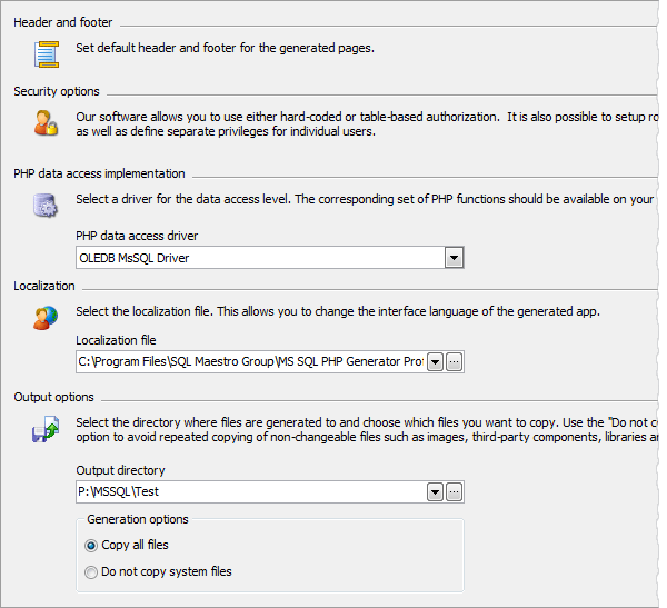 To make the repeated generating process more fast, it's recommended to avoid repeated copying of non-changeable system files stored in components, database_engine, images, libs folders. These files must be rewritten only in case they were generated by the former version of MS SQL PHP Generator.
