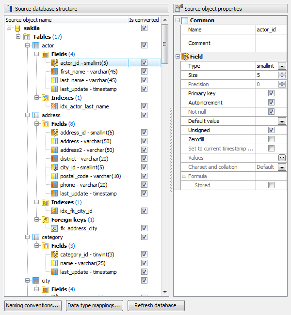 The Source database structure tab represents the schema of the source database and allows you to specify objects to be transferred to the target one. To include an object to the conversion process, turn on the corresponding "Is converted" option. To get the actual database objects tree, use the Refresh database button. The Source object properties tab allows you to browse the selected object's options.