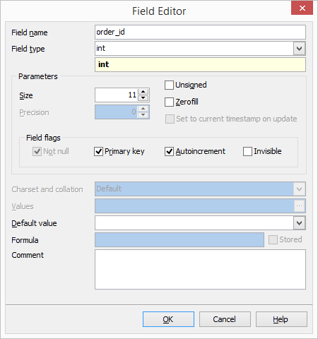 Use the Size edit box to define the length of the field value for integer, float, char and other data types and use Precision to define the precision of the field value, e.g. for float data type.