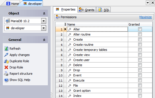 Role Editor is the basic SQL Maestro for MySQL tool for working with existing roles. It can be opened automatically after the role is created and is available on editing the role (see How to edit role for details).