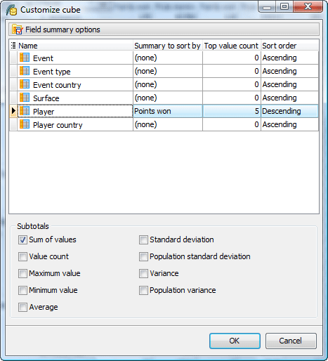 To set the aggregates calculated on the numeric columns, use the Customize cub window opened with the corresponding link at the Navigation bar. The window provides you also with an ability to specify columns the summary to be sorted by, the sort order and the max number of records represented in grid.