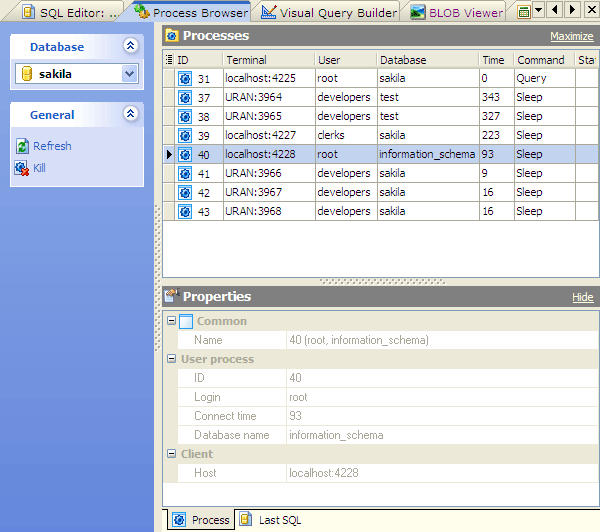 Process Browser is very useful tool for DBAs who want to monitor the users' activity (in fact, there are potentially thousands of sessions in a database at any one time). You can view details for each session (such as login, connect time, database name, client host, last SQL statement executed and more) as well as group and filter processes by client host, connected user, database, client application, etc.