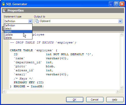 Among other features SQL Maestro for MySQL provides you with SQL Generator, a tool to create simple SQL statements. Just choose a database object, select statement type (Definition, Select, Insert, Update, or Delete) and the destination device (Clipboard, File, SQL Editor, SQL Script Editor).