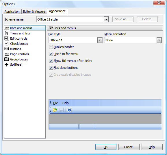 The item allows you to select Bar style and menu animation from the corresponding drop-down lists and to enable or disable such options as sunken border, F10 key for opening menu, viewing full menus after delay, flat close buttons, gray-scale images.