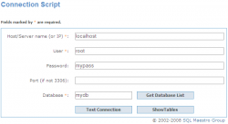 For this purpose you need to upload the connection PHP script (mysql_tunnel.php) to your website and enter the script URL as connection option. You can also test the script in your web-browser. |