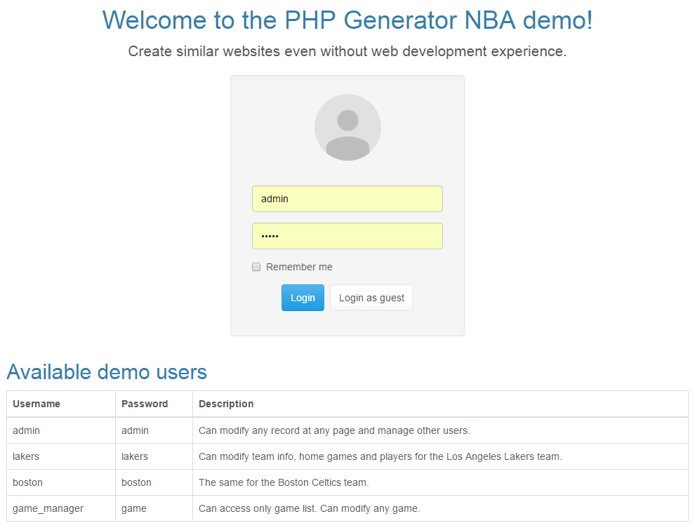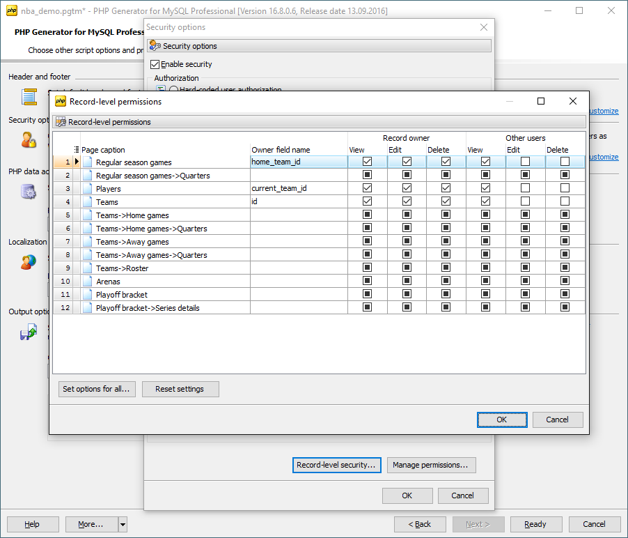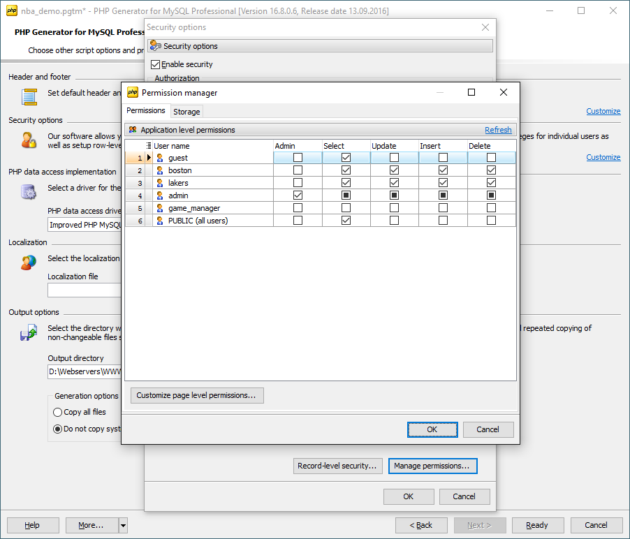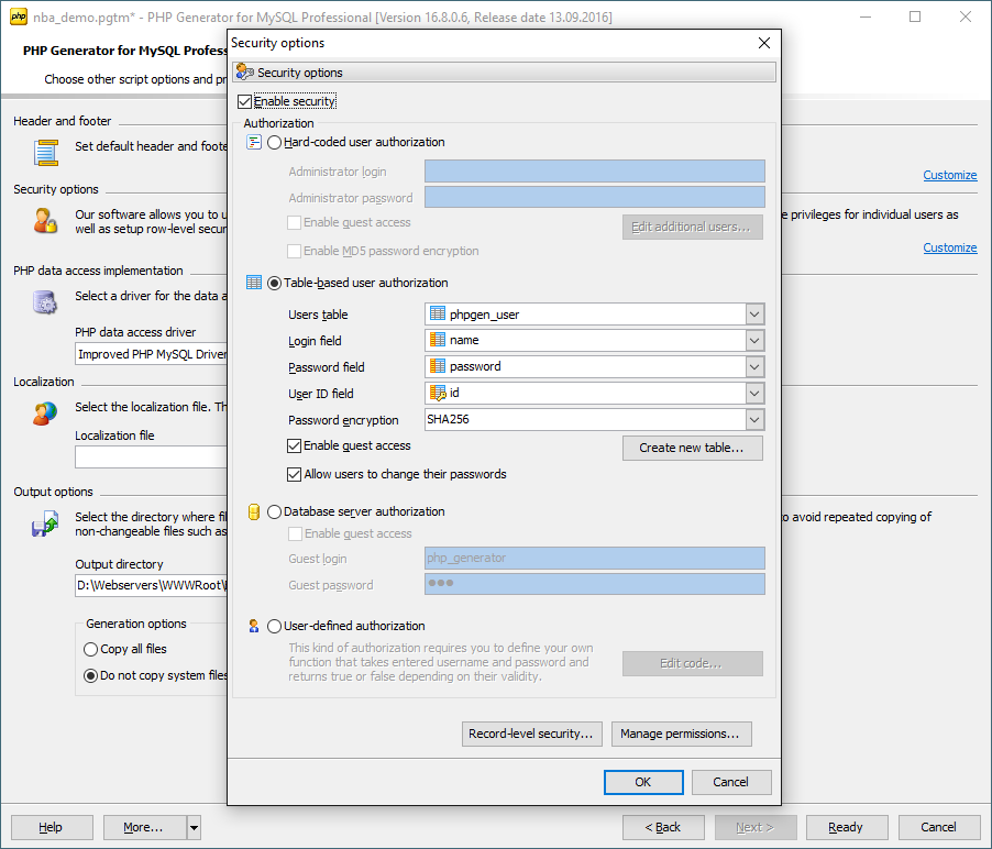 Safe and securePHP Generator for MySQL provides reliable data protection with application, page, and record level security. Support for self-registration of new users is available too. |