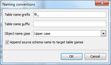 The Naming conventions window allows you to define rules to be applied for the names of the created objects. Here you can specify prefix and suffix for the target tables as well as the case of names of objects to be created. The Append source schema name to target table names checkbox allows you to choose whether source schema name will be added to target table names.