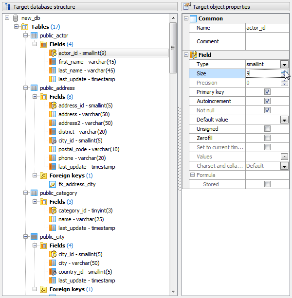 On this step you can customize the objects to be created in the target database. The Target object properties area on the right of the window allows you to change characteristics of the selected object such as name, comment, data type, etc.