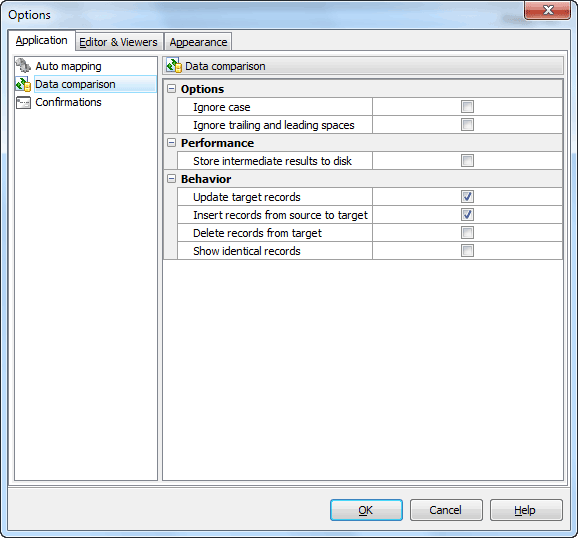 The Behaviour options group allows you to limit the synchronization process by processing only different records (the Update target records option), or/and rows that exist in the source table but not in the target one (the Insert records from source to target option), or/and rows that exist in the target table but not in the source one (the Delete records from target option).