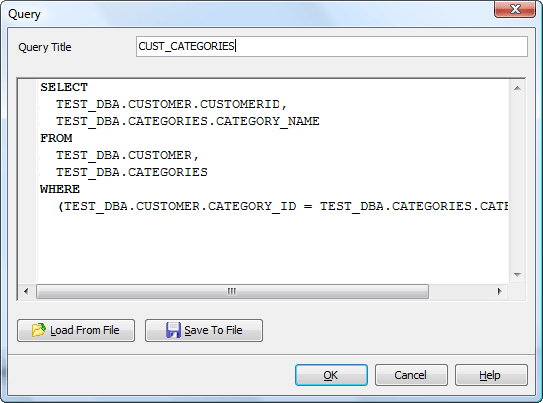 To use a custom SQL query as a data source, use the Create query button and enter the query name and a SELECT statement. It is also possible to load a query from an .sql file.