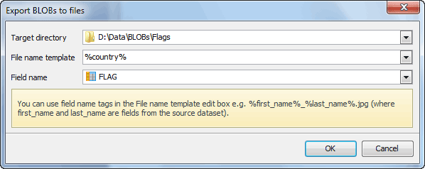 BLOB Viewer also allows you to save all BLOBs from a table or view to a given directory. Just click Save to files on the Navigation bar and fill all fields in the Export BLOBs window shown below. You can use table columns' names enclosed in % as a file name template.