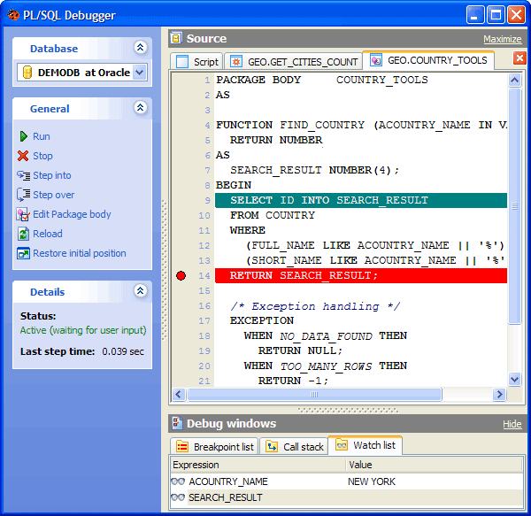 For those programming errors that are really hard to track, Oracle Maestro provides an integrated PL/SQL debugger. The main principles of the debugging process within the PL/SQL Debugger are similar to the same tools methods.