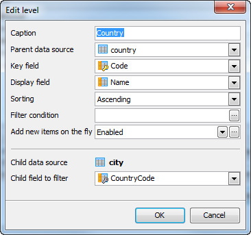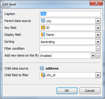 3. As described above, data sources for additional levels are placed in the reverse order of logical priority. The data entry order would be Country, City, and then Address, so the first additional level is intended for selecting a city. To add a new level for the control, click Add level and fill fields in the dialog window as follows: