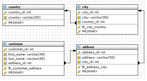 Let's consider step-by-step building of Country -> City -> Address control. Assume our database schema is as follows: